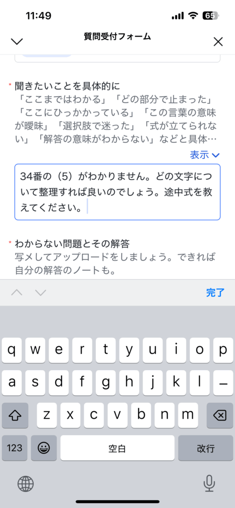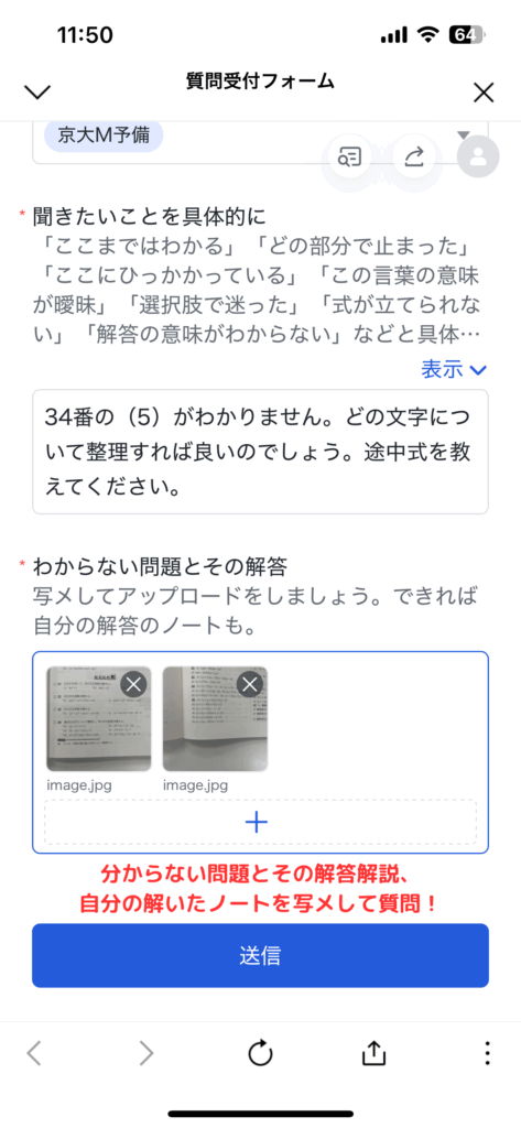 分からない問題と、その解答解説。そして生徒の解いた過程の見えるノートをスマホで写真に撮って、分からない箇所を具体的に書いたメッセージとともに送ってください。