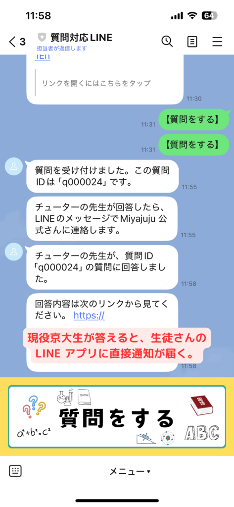 また、現役京大生からの回答があり次第、すぐに生徒さんのスマホのLINEアプリに直接回答が送られるので、生徒さんが塾にいなくても回答が届き、いつでも勉強のつまずきを解消できることも大きな利点と言えます。